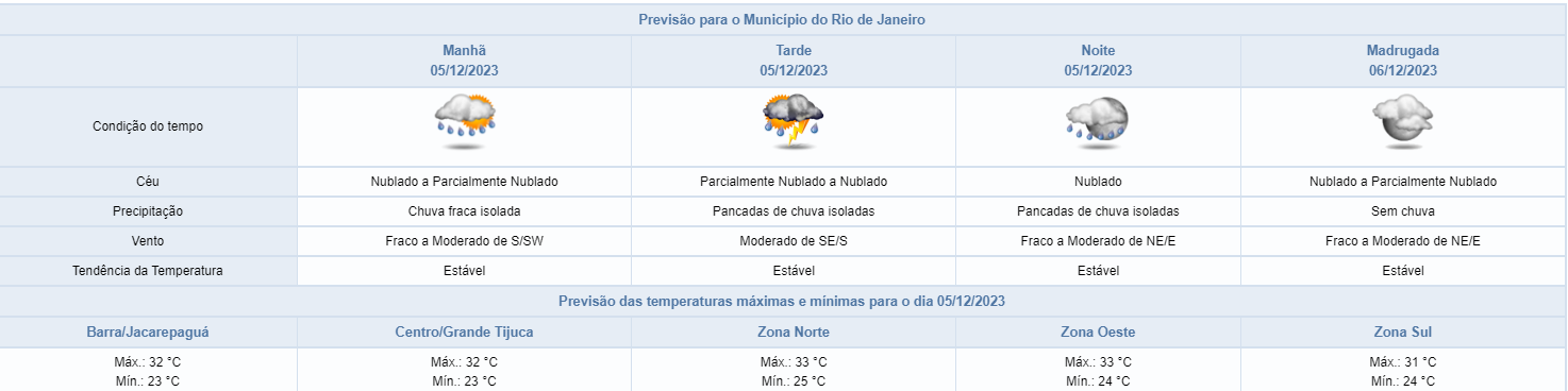 Segundo o Alerta Rio, nesta terça-feira, áreas de instabilidade em médios e altos níveis da atmosfera influenciarão o tempo na cidade do Rio de Janeiro. Assim, o céu estará predominantemente nublado e a partir da tarde, há previsão de pancadas rápidas e isoladas de chuva moderada, ocasionalmente forte, acompanhadas de raios. Os ventos estarão fracos a moderados, com rajadas ocasionalmente fortes durante as pancadas e as temperaturas permanecerão estáveis, com mínima de 23°C e máxima de 33°C. Na quarta-feira (06/12), o tempo permancerá instável na cidade do Rio de Janeiro, devido à atuação de áreas de instabilidade em médios níveis da atmosfera, com previsão de pancadas isoladas de chuva moderada a partir do final da tarde. A chuva poderá passar de 6,4mm/15min em pelo menos um ponto da cidade.