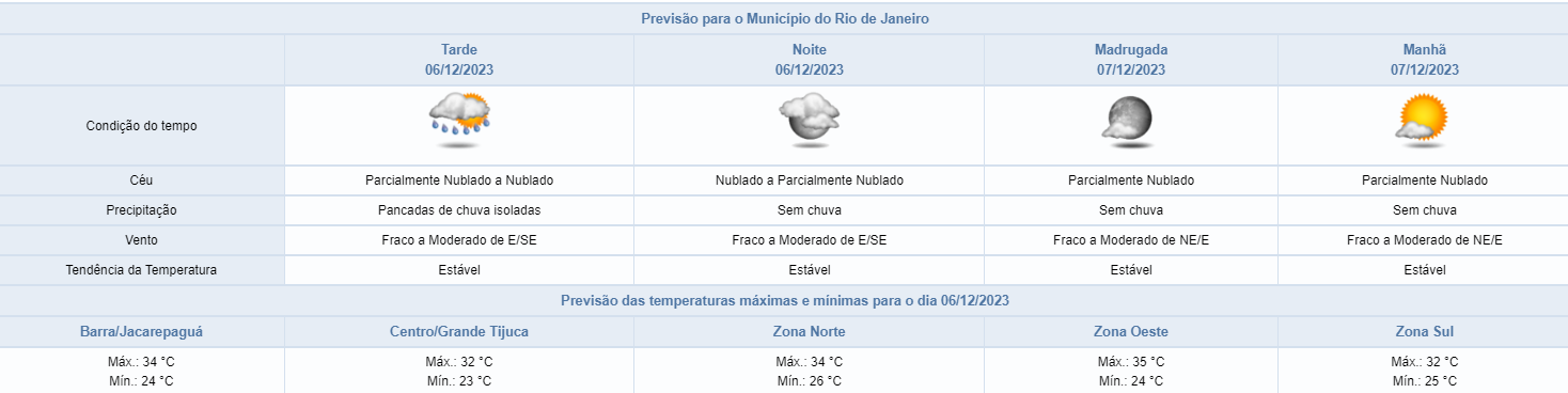 Segundo o Alerta Rio, nesta noite de quarta-feira (06/12), o céu estará parcialmente nublado a nublado e não há previsão de chuva. Na quinta-feira (07/12), as condições de tempo permanecerão instáveis na Rio, com previsão de pancadas isoladas de chuva moderada no período da noite. A chuva poderá passar de 10 mm/h em pelo menos um ponto da cidade.