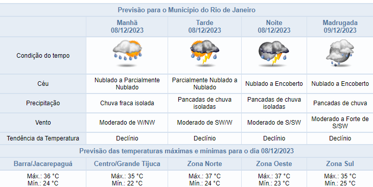 Segundo o Alerta Rio, no sábado (09/12), o transporte de umidade do oceano em direção ao continente manterá o tempo instável, com previsão de pancadas de chuva moderada, ocasionalmente forte, durante a madrugada, podendo vir acompanhada de raios. Ao longo do dia, a previsão é de chuva fraca a moderada a qualquer momento. A chuva poderá passar de 25mm/h em pelo menos um ponto da cidade, principalmente na madrugada. As temperaturas estarão em declínio acentuado.