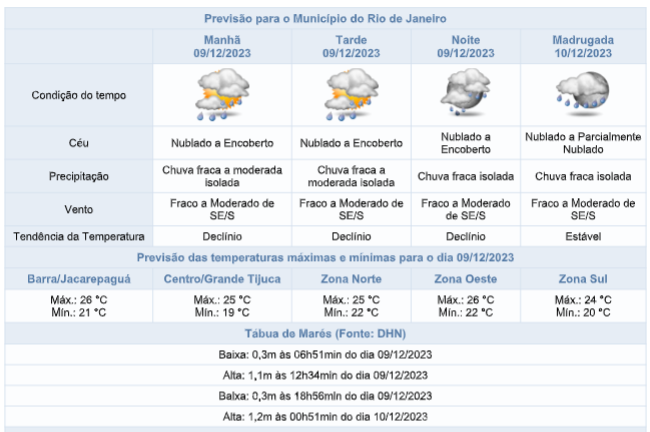 Segundo o Alerta Rio, neste sábado (09/12), o transporte de umidade do oceano para o continente manterá o tempo instável na cidade do Rio de Janeiro. Assim, o céu irá variar entre nublado e encoberto e há previsão de chuva fraca a moderada isolada a qualquer momento. Os ventos estarão moderados (entre 18,5 km/h a 51,9/h), com e as temperaturas apresentarão declínio acentuado em relação ao dia anterior, com mínima de 19°C e máxima de 26°C.