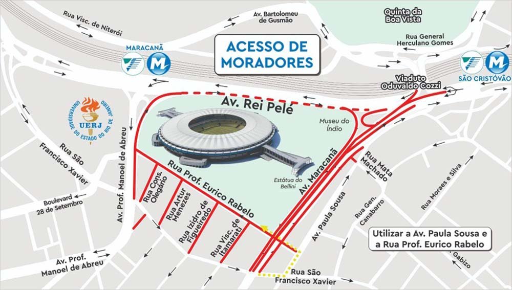 O acesso de veículos de moradores do entorno imediato ao Maracanã (ruas Prof. Eurico Rabelo, Visconde de Itamarati, Isidro de Figueiredo, Artur Menezes e Conselheiro Olegário) será feito, exclusivamente, pela Av. Paula Sousa e a Rua Prof. Eurico Rabelo, mediante apresentação de comprovante de residência.