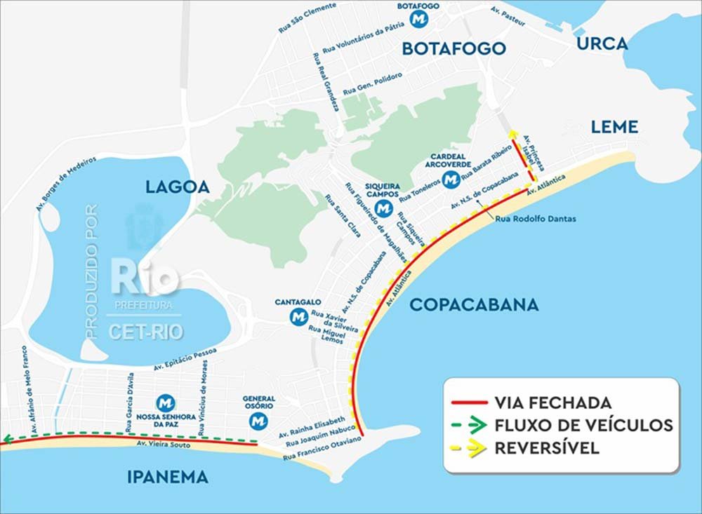 • Os acessos à Copacabana serão liberados para todos os veículos, permanecendo a interdição da Av. Atlântica, em ambas as pistas;
