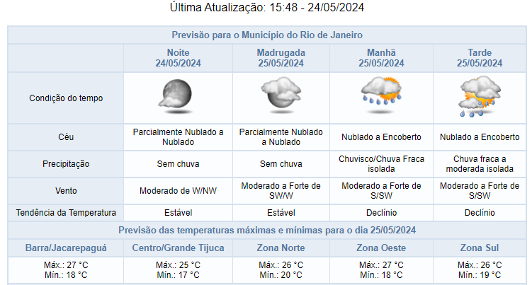 De acordo com o Sistema Alerta Rio, para este final desta  sexta-feira (24/05), haverá variação de nebulosidade sobre a cidade do Rio de Janeiro, e não há previsão de chuva.  Os ventos estarão fracos a moderados (até 51.9km/h).
