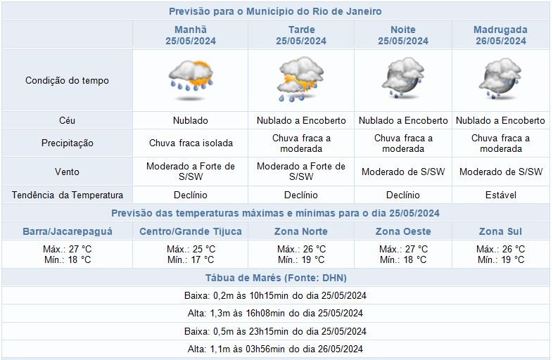 Segundo o Alerta Rio, neste sábado (25/05), a passagem de uma frente fria e o posterior transporte de umidade do oceano para o continente influenciam o tempo na cidade do Rio de Janeiro. Assim, ao longo do dia haverá aumento de nebulosidade, com céu nublado a encoberto e previsão de chuva fraca a moderada a partir do período da manhã. Os ventos estarão moderados a fortes e as temperaturas em declínio, com mínima prevista de 17°C e máxima prevista de 27°C.