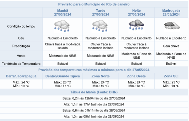 Segundo o Alerta Rio, o transporte de umidade do oceano em direção ao continente permanece influenciando o tempo na cidade do Rio nesta segunda-feira (27/05). Desta forma, ao longo do dia o céu estará nublado a encoberto e há previsão de chuva fraca a ocasionalmente moderada de forma isolada a qualquer momento. Os ventos estarão predominantemente moderados (entre 18,5 km/h a 51,9 km/h) e as temperaturas estáveis, com mínima prevista de 17°C e máxima prevista de 24°C.