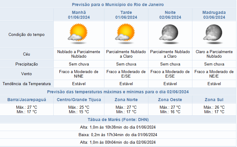 Segundo o Alerta Rio, neste sábado (01/06), um sistema de alta pressão no oceano irá influenciar o tempo no Rio, com redução de nebulosidade. Assim, o céu estará passando de nublado para parcialmente nublado/claro, sem previsão de chuva no município. As temperaturas seguem estáveis, com mínima prevista de 15°C e máxima de 27°C, e os ventos estarão fracos a moderados.