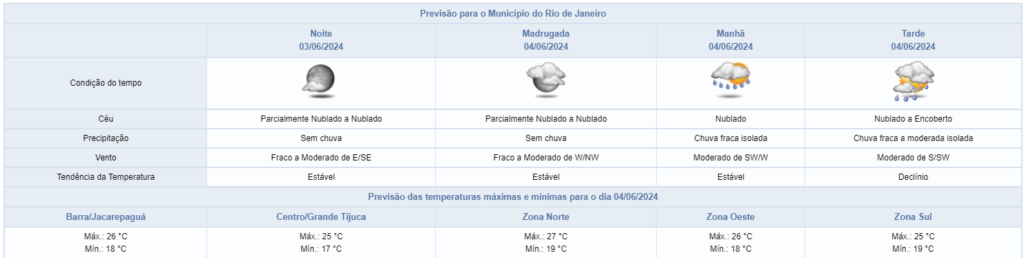 Na quinta-feira (06/06), ventos em médios e altos níveis da atmosfera influenciarão o tempo na cidade do Rio, com previsão de céu nublado passando a parcialmente nublado e chuvisco/chuva fraca isolada durante a madrugada. Os ventos estarão fracos a moderados.