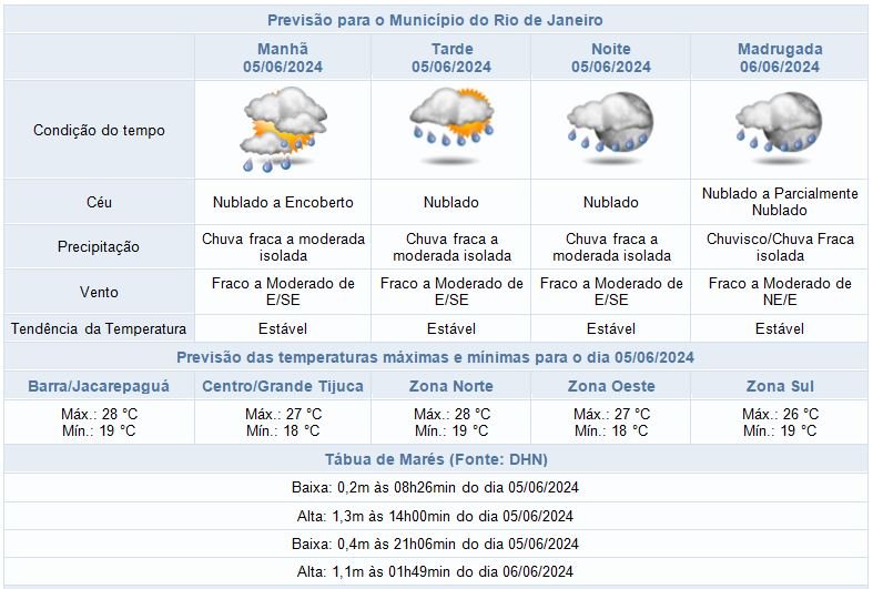 Nesta quarta-feira (05/06), o transporte de umidade do mar para o continente irá influenciar as condições de tempo no Rio. Assim, o céu estará variando entre encoberto e nublado, com previsão de chuva fraca a moderada isolada no município. As temperaturas seguem amenas, com mínima prevista de 18°C e máxima de 28°C, e os ventos estarão fracos a moderados.