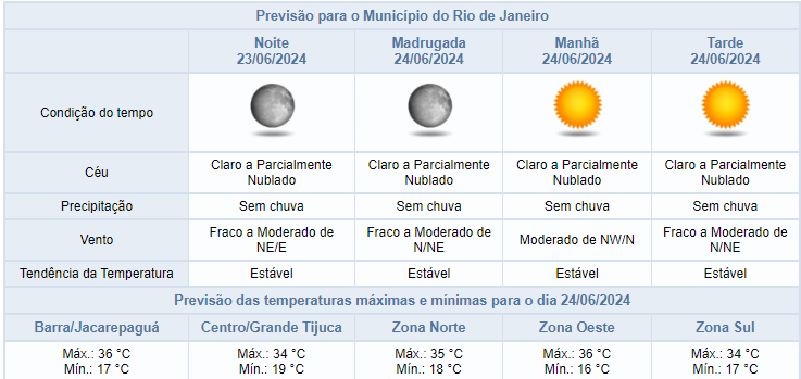 Segundo o Alerta Rio, para esta noite de domingo (23/06), o céu estará claro a parcialmente nublado na cidade do Rio de Janeiro e não há previsão de chuva. Os ventos estarão fracos a moderados. A influência de um sistema de alta pressão manteve o tempo estável na cidade do Rio de Janeiro, neste domingo. O céu esteve predominantemente claro e não houve registro de chuva. As temperaturas estiveram estáveis em relação ao dia anterior, com mínima registrada de 19,3°C às 00h20min e máxima registrada de 34,7°C às 14h25min.