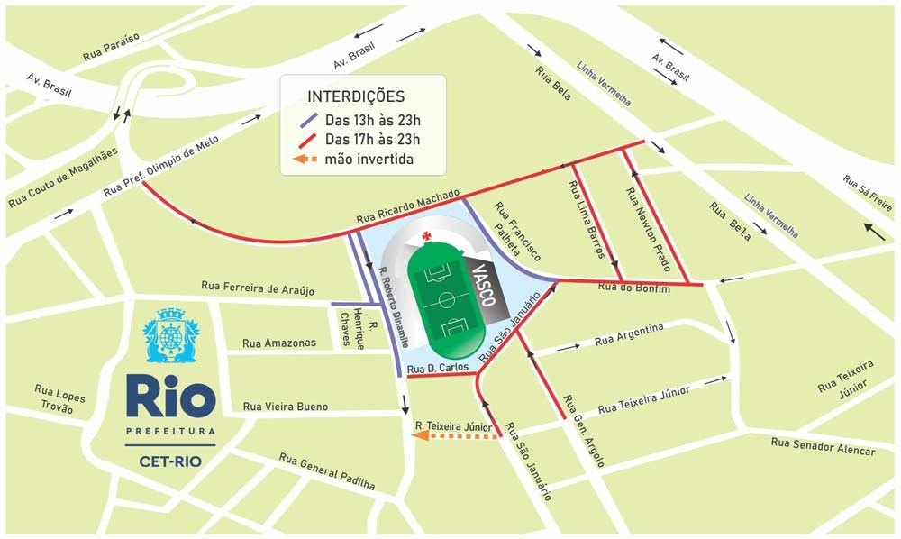 O Centro de Operações Rio, através da CET-Rio, implantará operação de trânsito, nesta quarta-feira, dia 03/07, para o jogo entre Vasco e Fortaleza pelo Brasileirão 2024, que acontecerá às 20h, em São Januário, no Vasco da Gama. A partir das 13h, haverá interdições ao trânsito de veículos na região onde acontece a partida.