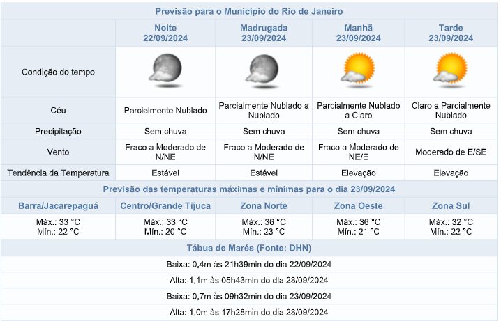 Segundo informações do Alerta Rio, nesta noite de domingo (22/09), o céu estará parcialmente nublado na cidade do Rio e não há previsão de chuva. Os ventos estarão fracos a moderados.