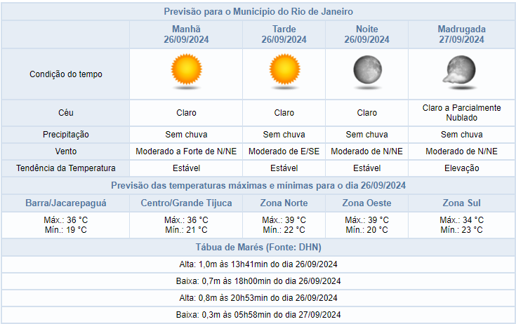 Segundo o Alerta Rio, nesta quinta-feira (26/09), o tempo no município do Rio de Janeiro segue estável por conta da influência de um sistema de alta pressão no oceano. A previsão é de céu claro e sem chuva. A umidade relativa do ar poderá apresentar valores entre 21% e 30% no período da tarde. Os ventos estarão moderados na maior parte do dia, com rajadas fortes pontuais no período da manhã. As temperaturas permanecem elevadas, com máxima de 39°C.