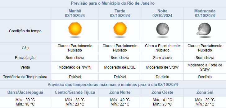 Segundo o Alerta Rio, nesta quarta-feira (02/10), tempo segue estável no município do Rio. Assim, a previsão é de céu claro a parcialmente nublado ao longo do dia e sem ocorrência de chuva. Os ventos estarão predominantemente moderados. As temperaturas seguem elevadas, com máxima de 41°C e a umidade relativa do ar poderá apresentar valores entre 21% e 30%.