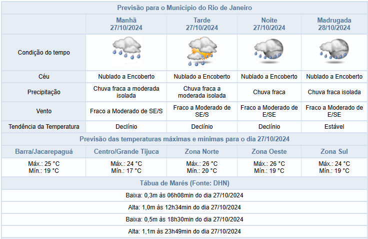 Na segunda-feira (28/10), ventos úmidos do oceano ainda influenciam o tempo na cidade do Rio. A previsão é de céu nublado a encoberto com chuva fraca a qualquer momento. Os ventos estarão variando entre fracos e moderados.
