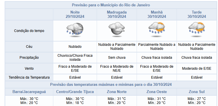 Segundo o Alerta Rio, este na noite desta terça-feira (29/10), haverá predomínio de céu nublado na cidade do Rio, com previsão de chuva fraca em pontos isolados. Os ventos estarão fracos a moderados. O tempo nesta terça-feira foi influenciado pela entrada de ventos úmidos do mar. Assim, o dia foi com predomínio de céu nublado e houve registro de chuvisco isolado. Os ventos ficaram fracos a moderados e as temperaturas apresentaram elevação, com mínima registrada de 17,9°C às 04h35min na estação Alto da Boa Vista (Alerta Rio) e máxima registrada de 29,5°C às 11h00min na estação Irajá (Alerta Rio).