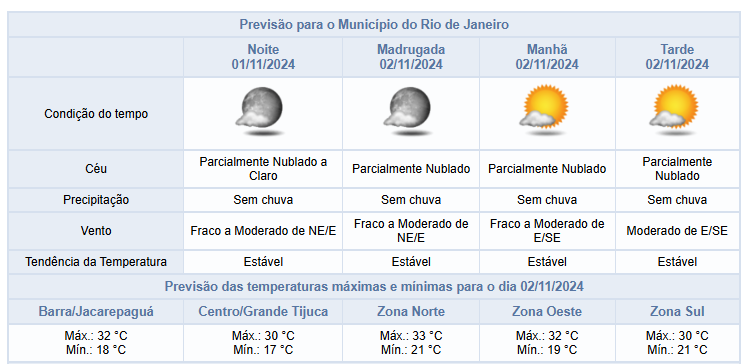 A noite de sexta-feira (01/11) deve ser de céu parcialmente nublado e não há previsão de chuva. Os ventos estarão fracos a moderados. Nesta sexta-feira, o tempo permaneceu estável na cidade do Rio de Janeiro. Desta forma, o céu esteve parcialmente nublado a claro e não houve registro de chuva. Os ventos estiveram fracos a moderados, sendo mais intensos no período da tarde, e as temperaturas permaneceram estáveis em relação ao dia anterior, com mínima registrada de 16,9°C às 04h35min na estação Alto da Boa Vista (Alerta Rio) e máxima registrada de 32,3°C às 13h20min na estação Irajá (Alerta Rio).