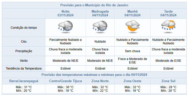 Nesta noite de domingo (03/11), segundo o Alerta Rio, há previsão de chuva fraca, podendo ser moderada de forma rápida e isolada. Os ventos estarão moderados. Neste domingo, áreas de instabilidade em médios níveis da atmosfera em conjunto com o calor influenciaram o tempo na cidade do Rio de Janeiro. Assim, o céu esteve parcialmente nublado a nublado e não houve registro de chuva, até o momento. Os ventos estiveram fracos a moderados e as temperaturas permaneceram estáveis em relação ao dia anterior, com mínima registrada de 18°C às 5h e máxima registrada de 34,9°C às 14h20.