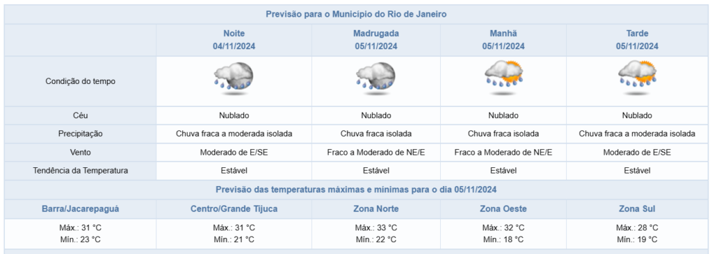 A noite desta segunda-feira (04/11) termina com temperaturas estáveis e há possibilidade de chuva fraca a moderada isolada. Os ventos devem estar moderados. A máxima registrada hoje foi de 32,2°C e a mínima, 18,3°C, de acordo com o Alerta Rio.