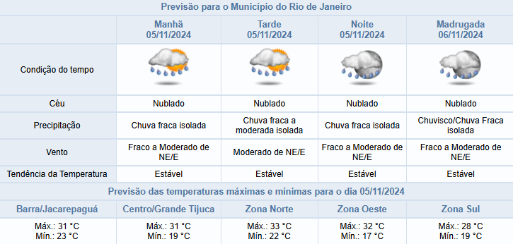 De acordo com o Alerta Rio, nesta terça-feira (05/11), o tempo segue instável na cidade do Rio. O predomínio será de céu nublado, com previsão de chuva fraca a qualquer momento, podendo ser ocasionalmente moderada no período da tarde. Os ventos estarão variando entre fracos e moderados e as temperaturas permanecerão estáveis, com mínima prevista de 17°C e máxima prevista de 33°C.