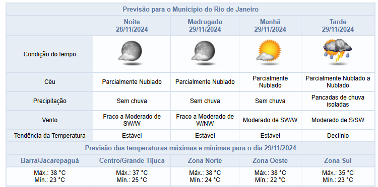 Na sexta-feira (29/11), em função de áreas de instabilidades associadas ao calor, a previsão para a cidade do Rio é de céu parcialmente nublado a nublado com pancadas de chuva isoladas nos períodos da tarde e noite, podendo vir com raios. Os ventos estarão fracos a moderados.