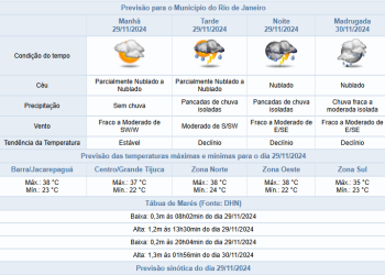 Noticias 29 de novembro de 2024 Previsão de pancadas de chuva a partir da tarde desta sexta-feira (29/11) na cidade do Rio de Janeiro