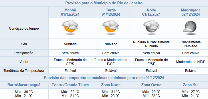 Segundo o Alerta Rio, neste domingo (01/12), ventos úmidos do oceano permanecem influenciando o tempo na cidade do Rio. A nebulosidade estará variada com predomínio de céu nublado, entretanto, não há previsão de chuva. Os ventos estarão fracos a moderados e as temperaturas estáveis, com mínima prevista de 21°C e máxima prevista de 31°C.