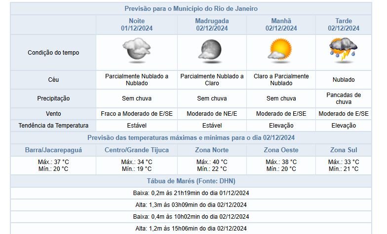 Na segunda-feira (02/12) o calor e a aproximação de uma frente fria deixarão o tempo instável, com aumento de nebulosidade ao longo do dia e previsão de pancadas de chuva a partir do final do período da tarde, acompanhadas de raios. Os ventos estarão predominantemente moderados.
