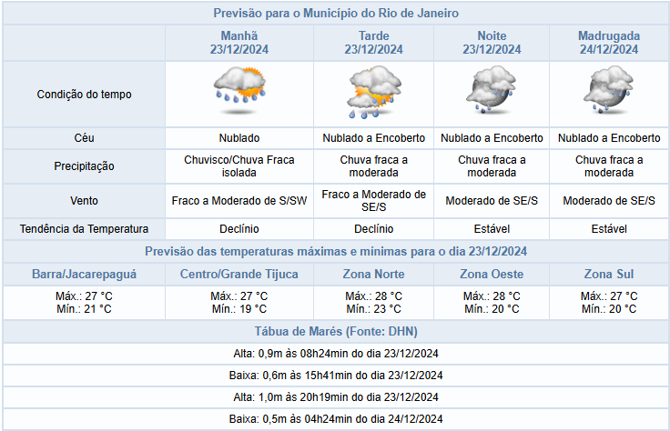 Nesta terça-feira (24/12), ainda em função da atuação da Zona de Convergência do Atlântico Sul (ZCAS), o céu estará nublado a parcialmente nublado e há previsão de chuva fraca a moderada na madrugada/manhã, passando a chuva fraca no período da tarde. Os ventos estarão variando entre fracos e moderados.