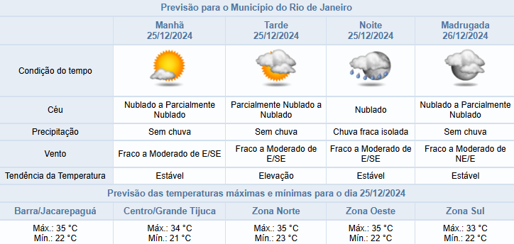 Segundo o Alerta Rio, nesta quarta-feira de Natal (25/12), o tempo será de calor e nebulosidade variada na cidade do Rio de Janeiro. A previsão é de céu parcialmente nublado a nublado na maior parte do dia, com ocorrência de chuva fraca na noite, de forma isolada. As temperaturas apresentarão elevação, com máxima prevista de 35°C e os ventos estarão fracos a moderados.