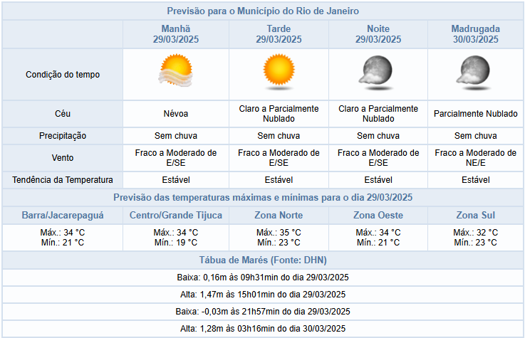 Segundo o Alerta Rio, o céu vai variar entre claro e parcialmente nublado, com possibilidade de névoa no início da manhã deste sábado (29/03), na cidade do Rio de Janeiro. Não há previsão de chuva. As temperaturas seguirão estáveis, com mínima prevista de 19ºC e máxima prevista de 35ºC. Os ventos estarão fracos a moderados.