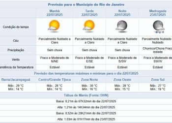 Noticias 22 de julho de 2025 Terça-feira (22/07) com previsão de céu claro a parcialmente nublado na cidade do Rio, sem chuva