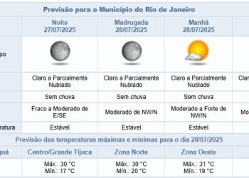 Noticias 27 de julho de 2025 Domingo (27/07) com tempo estável e máxima de 32,1°C no Rio | Previsão de pancadas de chuva para amanhã