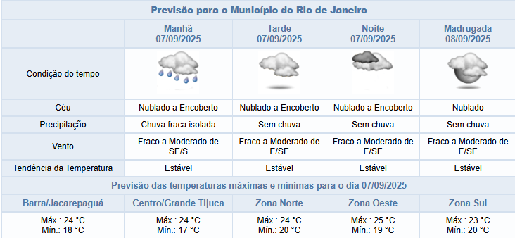 Segundo o Alerta Rio, neste domingo (7/9), o tempo segue influenciado pelo transporte de umidade do oceano em direção ao continente. Para hoje, o céu estará nublado/encoberto e com possibilidade de chuva fraca até o período da manhã. Os ventos estarão variando entre fracos e moderados e as temperaturas estarão estáveis, com mínima de 17°C e máxima prevista de 25°C.