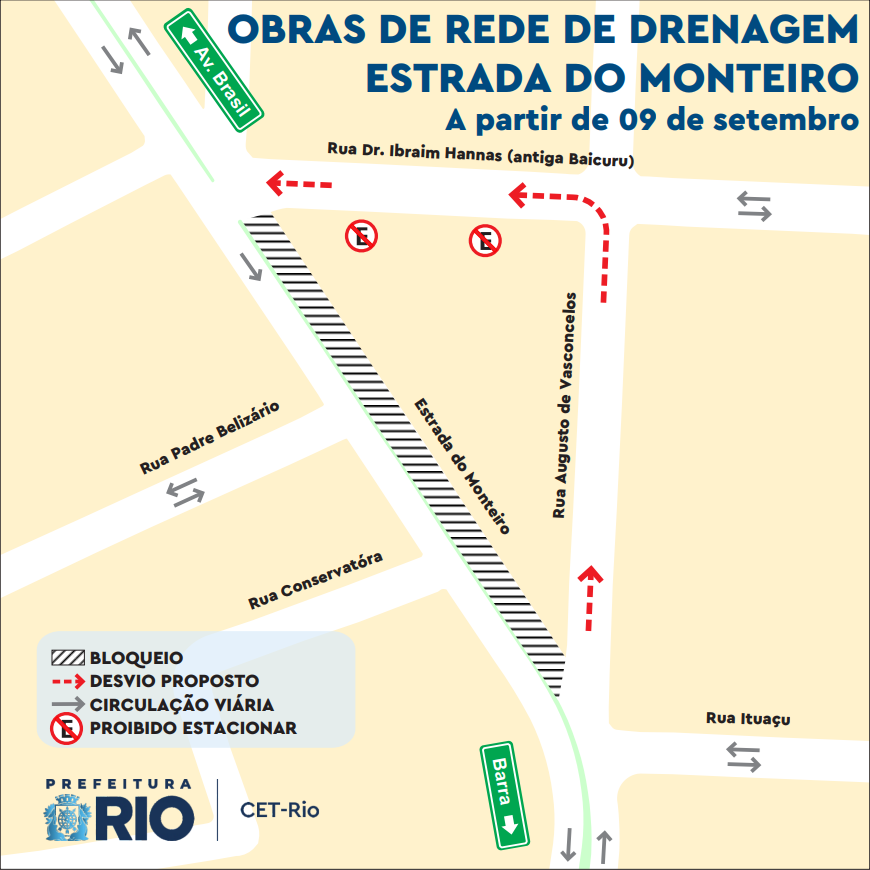 O Centro de Operações e Resiliência da Prefeitura do Rio (COR-Rio) informa que a Estrada do Monteiro será parcialmente interditada para obras na rede de águas pluviais. O serviço será executado a partir desta terça-feira (9/9), às 7h.