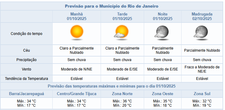 Segundo o Alerta Rio, esta quarta-feira (01/10) será mais um dia de tempo estável e temperaturas elevadas na cidade do Rio de Janeiro. O céu estará claro a parcialmente nublado e não há previsão de chuva. Os ventos estarão predominantemente moderados, principalmente na região costeira, e as temperaturas estáveis, com mínima prevista de 17°C e máxima prevista de 36°C.