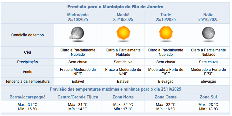Segundo o Alerta Rio, neste sábado (25/10) as condições de tempo no município permanecerão estáveis devido ao posicionamento de um sistema de alta pressão no oceano. Desta forma, o céu estará com poucas nuvens e não há previsão de chuva. Os ventos estarão moderados, com rajadas fortes no período da tarde/noite e as temperaturas apresentarão elevação, com mínima prevista de 15°C e máxima prevista de 32°C.