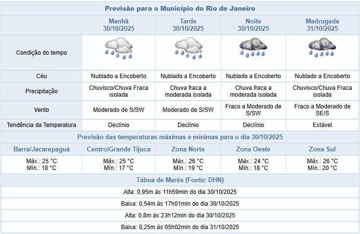 Segundo o Alerta Rio, há previsão de chuva fraca a qualquer hora desta quinta-feira (30/10), na cidade do Rio de Janeiro, sendo moderada, isolada, a partir da tarde. Ventos úmidos do oceano deixam o céu entre encoberto e nublado. As temperaturas estarão em declínio, com máxima prevista de 26°C. Os ventos estarão moderados.
