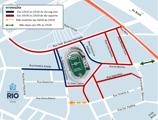 – Rua do Bonfim, no sentido ao Estádio de São Januário, entre a rua Newton Prado e a rua São Januário;