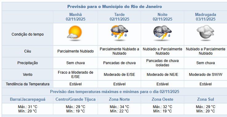 Segundo o Sistema Alerta Rio, neste domingo (02/11) o tempo na cidade do Rio será influenciado por áreas de instabilidade somadas ao calor e umidade. Assim, o céu estará parcialmente nublado a nublado e há previsão de pancadas de chuva nos períodos da tarde e noite, podendo vir acompanhadas de raios. Os ventos estarão fracos a moderados, sendo mais intensos na tarde/noite e as temperaturas permanecerão estáveis e elevadas, com mínima prevista de 19°C e máxima prevista de 34°C.