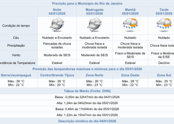 Noticias 4 de janeiro de 2026 Final da tarde de domingo (04/01) será de tempo instável e com ventos moderados na capital fluminense