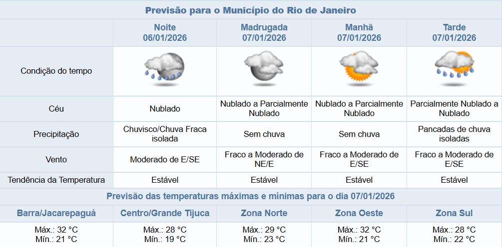 De acordo com o Sistema Alerta Rio, na noite desta terça-feira (06/01), o céu estará nublado e há previsão de chuvisco/chuva fraca isolada. Os ventos estarão moderados.