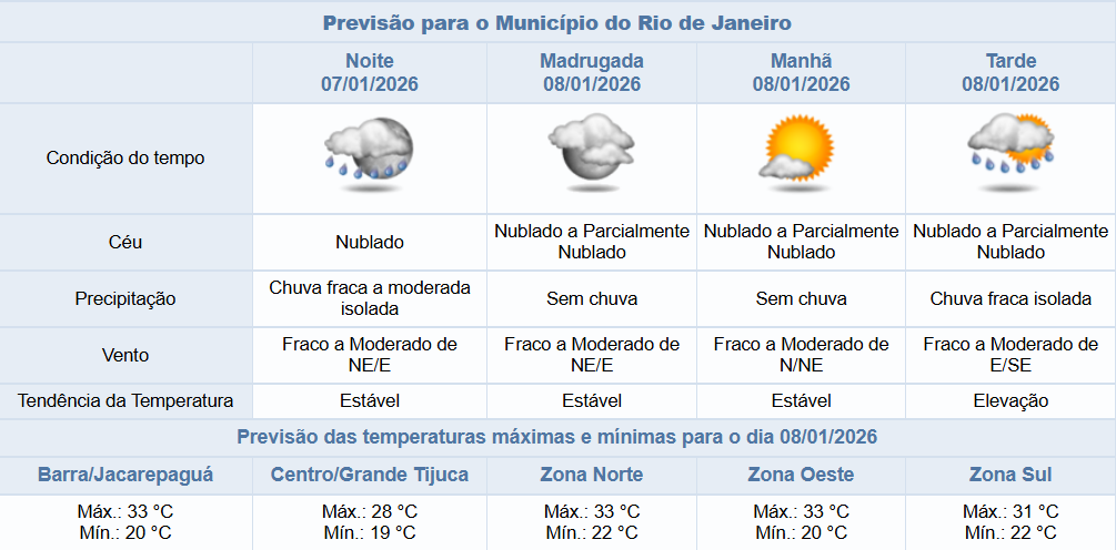 Segundo 0 Sistema Alerta Rio, na noite desta quarta-feira (07/01), o céu estará predominantemente nublado na cidade do Rio e há possibilidade de chuva fraca a ocasionalmente moderada isolada. Os ventos estarão fracos a moderados.