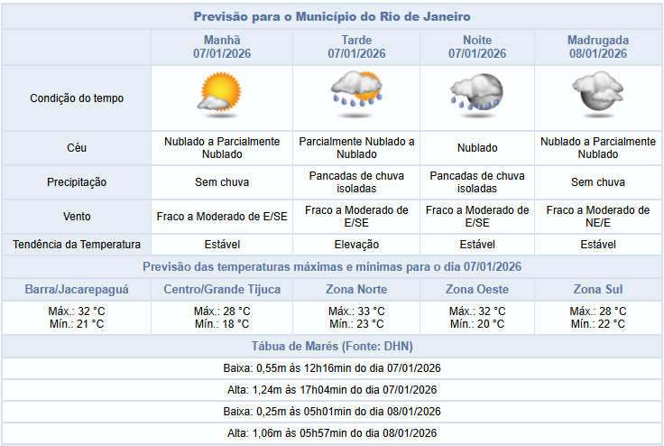 Segundo o Alerta Rio, há possibilidade de pancadas isoladas de chuva a partir da tarde desta a quarta-feira (07/01), na cidade do Rio de Janeiro. Áreas de instabilidade associadas a um canal de umidade vão influenciar o tempo, deixando o céu com nebulosidade variada. Temperaturas em elevação, com máxima prevista de 33°C. Ventos fracos a moderados.