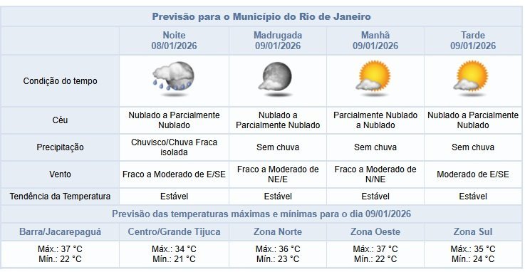Segundo o Alerta Rio, neste final de tarde e na noite desta quinta-feira (08/01) o céu estará nublado a parcialmente nublado na cidade do Rio de Janeiro e há previsão de chuvisco/chuva fraca isolada. Os ventos estarão fracos a moderados.