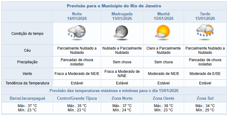 Segundo o Alerta Rio, o fim de tarde e noite desta quarta-feira (14/01) na cidade do Rio será de céu parcialmente nublado a nublado, com previsão de pancadas de chuva isoladas, podendo vir acompanhada de raios. Os ventos estarão moderados. Mais cedo, o céu esteve claro no período da manhã, passando a nublado à tarde, com registro de chuva fraca em pontos isolados. Os ventos estiveram fracos a moderados e as temperaturas elevadas, com mínima registrada de 21,3°C e máxima registrada de 38,4°C.