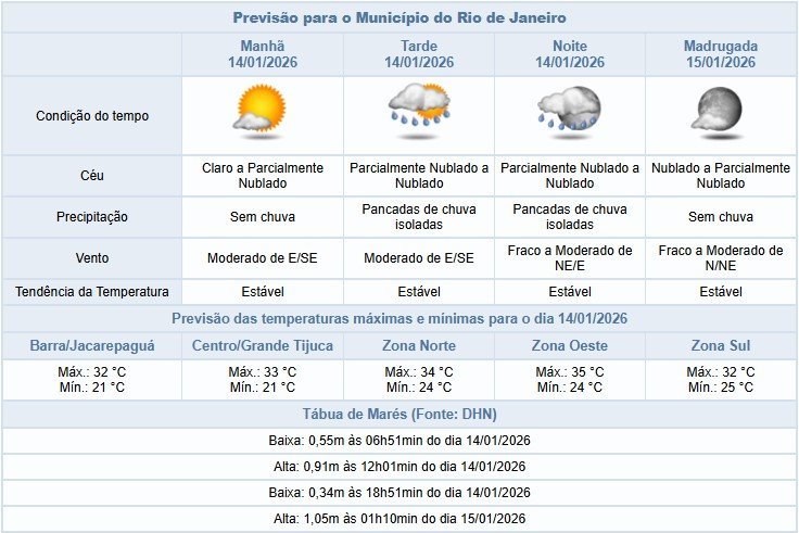Segundo o Alerta Rio, há possibilidade de pancadas isoladas de chuva a partir da tarde desta quarta-feira (14/01), na cidade do Rio de Janeiro. O tempo será influenciado por áreas de instabilidade associadas ao calor e à umidade, deixando o céu com nebulosidade variada. Temperaturas estáveis e elevadas, com máxima prevista de 35°C. Ventos fracos a moderados, sendo mais intensos pela manhã e à tarde.