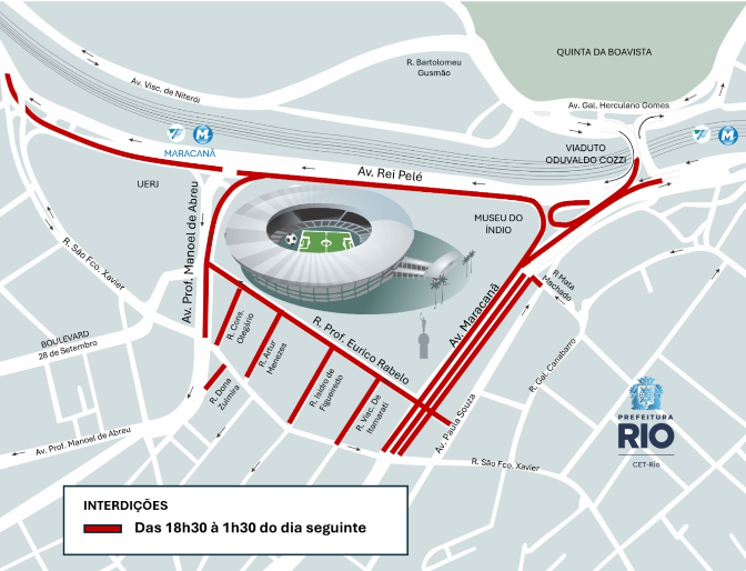 O Centro de Operações e Resiliência da Prefeitura do Rio (COR-Rio) informa que uma esquema de trânsito foi elaborado nesta quarta-feira (21/01), para a realização do jogo entre Flamengo e Vasco, pelo Campeonato Carioca, que acontece às 21h30, no estádio do Maracanã. As interdições ao trânsito de veículos na região começam a partir das 18h30, com proibiação de estacionamento a partir das 10h.