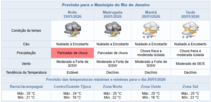 Na terça-feira (20/01), devido à passagem de uma frente fria em conjunto com a atuação de um canal de umidade na Região Sudeste, o céu estará nublado a encoberto e a previsão é de pancadas de chuva acompanhadas de raios na madrugada, passando a chuva moderada a partir da manhã. Os ventos estarão moderados a fortes e as temperaturas apresentarão declínio acentuado.