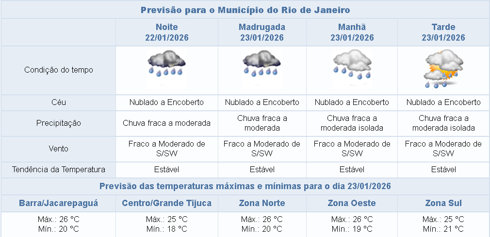 Entre a sexta e a segunda-feira (23/01 a 26/01), a atuação da Zona de Convergência do Atlântico Sul (ZCAS) sobre a Região Sudeste manterá o tempo instável na cidade do Rio de Janeiro.O céu estará nublado a encoberto e a previsão é de chuva fraca a moderada a qualquer momento da sexta-feira e sábado e na tarde/noite do domingo e segunda-feira. Os ventos estarão fracos a moderados.