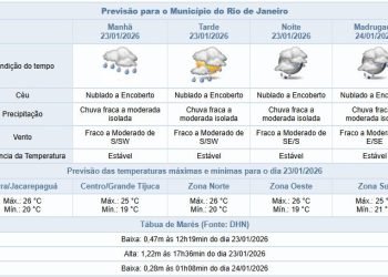 Noticias 23 de janeiro de 2026 Sexta-feira (23/01) com previsão de chuva isolada, na cidade do Rio de Janeiro; máxima de 26ºC